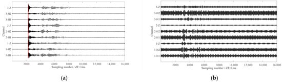 The processed results using the proposed method. (a,b) The de-noised signals and the removed interferences, respectively. The amplitude ranges of waveforms are the same. The red lines in (a) indicate the manually picked direct P-wave arrival times.