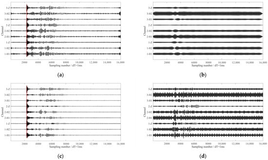 We applied the proposed method to reduce the strong interference noise, the initial center frequency ωd was set to 15, and the penalty parameter α varies from 1000 to 100,000 with an interval of 1000. In this case, the optimal penalty parameter was calculated by taking the maximum value of S/N of the de-noised signals in the window following seismic arrivals. Considering that the target reservoir was located at a depth of 300 m, a 6 s time window was selected to retain as much reflected wave information as possible. The optimal penalty parameter was determined by maximizing the S/N of the de-noised signals. When the penalty parameter was set to 29,000, the de-noised results were optimal. Waveforms in Figure 11a,b show the de-noised signals and the removed interferences via the proposed method. It can be seen from the de-noised waveforms that seismic signals were much clearer, particularly in the horizontal components. To quantitatively analyze the effectiveness of the de-noising, we calculated the S/Ns and rectilinearities of the direct P-wave in 3-C seismic signals. The time window used for these calculations encompassed 50 sampling numbers after the arrival of the direct P-wave. The results are listed in Table 1 and Table 2.