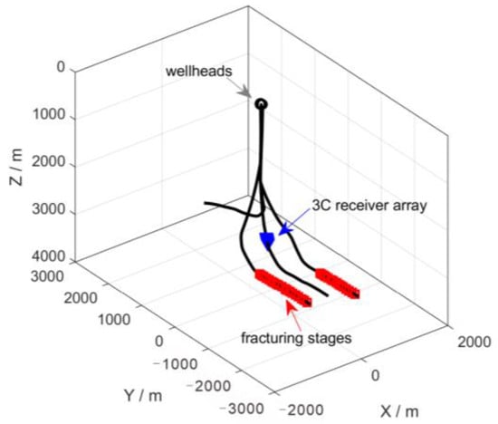 The second field dataset was recorded from microseismic monitoring of a hydraulic fracturing job in a shale gas play in Chongqing, China. A temporary string composed of 14 levels of triaxle 15-Hz geophones was deployed in the inclined section of a horizontal well to monitor the stimulations. The data sampling interval was 0.25 ms, and the receiver spacing interval was 10 m. Figure 13 shows the survey geometry in this case. Since the wellhead of the monitoring well was close to that of the treatment well, the downhole geophones continuously recorded fracturing pump vibration signals.