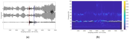 The 3-C microseismic data from a hydraulic fracturing downhole monitoring. (a) The 3-C waveforms of a microseismic event. (b) The time-frequency analysis of N-component data. The red and blue lines in (a) represent the manually picked P-wave and S-wave arrival times, respectively.