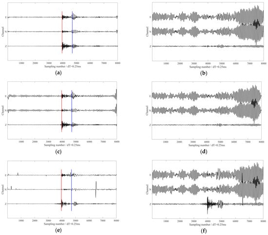 We extracted and removed the above three interference frequencies using the proposed method. Waveforms in Figure 15a,b show the de-noised signals and the removed interferences via MVME. The arrival of the microseismic signals were more apparent after removal of interference noise. The time windows for calculating the signal-to-noise ratio (S/N) and rectilinearity are defined as follows: for the P-wave, the time window was 100 sampling numbers after the P-wave arrival; for the S-wave, the time window was 200 sampling numbers after the S-wave arrival. The S/N calculation time window for the entire microseismic event was 2000 sampling numbers after the P-wave arrival. We can see from Table 3 and Table 4 that the S/Ns and the rectilinearities of the microseismic signals and P-wave were also increased using the proposed method. We also applied the notch filters and SST method to the same dataset for comparison. The de-noised signals and the removed interferences obtained using the notch filters are shown in Figure 15c,d, and the results obtained using the SST method are shown in Figure 15e,f. Both methods struggled to eliminate the interferences, which was reflected in the S/Ns (as shown in Table 3) and rectilinearities of the P-wave (as shown in Table 4). Although the notch filter was applied with carefully selected parameters, it failed to eliminate interferences in two horizontal components. The de-noised signals indicated that the notch filter resulted in insufficient processing and had limited improvement in the S/N of the microseismic event. Although the SST method significantly enhanced the S/Ns, the processing results show that the amplitudes of the P-waves were corrupted (as shown in Figure 15f). In comparison, the proposed method demonstrated more pronounced advantages in de-noising effectiveness and preserving the effective P-wave signal. The actual data contained weak effective S-wave signals that overlapped significantly in frequency with interference signals and it poses a challenging problem for current de-noising methods. The methods mentioned in this paper showed no significant improvement in de-noising under such conditions. However, after applying the proposed method, the S-wave arrival became more apparent, aiding in accurate source localization in subsequent processing.