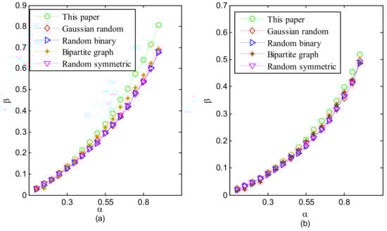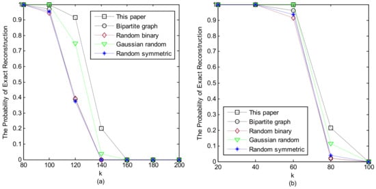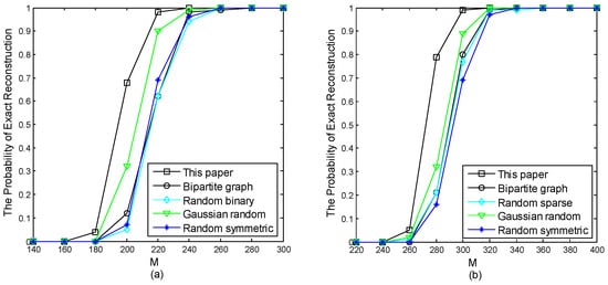 In this part, two kinds of randomly generated sparse signals were used as test signals: Gaussian random sparse signals and binary uniform sparse signals. Their generation method was elaborated on in Section 3. In the noiseless scenario, the performance of the measurement matrix was assessed by the ratio between the number of successful reconstructions and the total number of trials. A successful reconstruction condition is defined in (11), and number of total trials was 300.