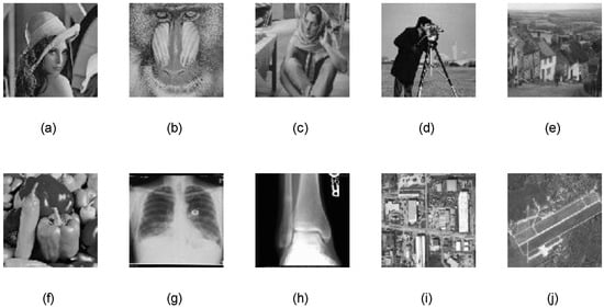 Test images: (a) Lena, (b) Baboon, (c) Barbara, (d) Cameraman, (e) Goldhill, (f) Peppers, (g) Bone1, (h) Bone2, (i) Aerial image1, and (j) Aerial image2.