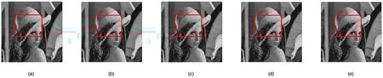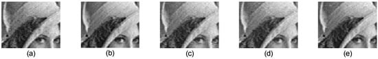 Details of reconstructed Lena: (a) Gaussian random measurement matrix, (b) our proposed measurement matrix, (c) random binary measurement matrix, (d) random symmetric measurement matrix, and (e) bipartite graph measurement matrix.