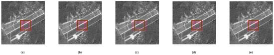 Details of reconstructed Aerial image2: (a) Gaussian random measurement matrix, (b) our proposed measurement matrix, (c) random binary measurement matrix, (d) random symmetric measurement matrix, and (e) bipartite graph measurement matrix.
