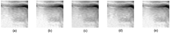 Details of reconstructed Bone2: (a) Gaussian random measurement matrix, (b) our proposed measurement matrix, (c) random binary measurement matrix, (d) random symmetric measurement matrix, and (e) bipartite graph measurement matrix.