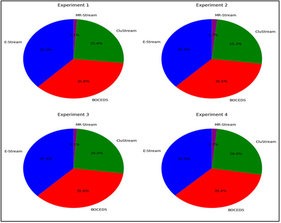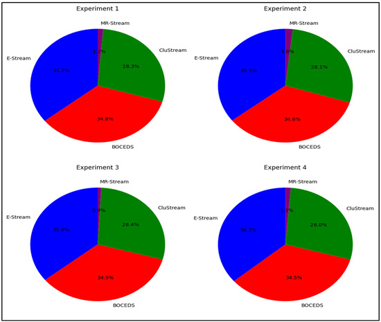 The experimental results, as shown in Figure 5, highlight the superior performance of the E-Stream algorithm, which consistently achieved the highest Rand Index (RI) scores across all four experiments. E-Stream’s Rand Index values ranged from 32.7% to 33.2%, indicating its strong ability to generate clusters that closely align with the actual data labels. DenStream followed closely behind, with Rand Index scores ranging from 30.7% to 31.6%, performing well but slightly below E-Stream. CluStream exhibited moderate performance, with Rand Index values between 24.9% and 25.1%. In contrast, MR-Stream consistently underperformed, with the lowest Rand Index scores ranging from 10.4% to 11.1%, indicating poor clustering accuracy. These results emphasize that E-Stream consistently produced the most accurate clusters, as demonstrated in Figure 5.