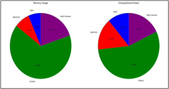 Moreover, a comparison of the computational efficiency between the E-Stream algorithm and the DenStream, CluStream, and MR-Stream algorithms is displayed in Figure 6. The figure demonstrates that the E-Stream algorithm requires significantly less computational resources compared to the other algorithms, with CluStream demanding the most computational power, while E-Stream exhibited the most efficient usage.