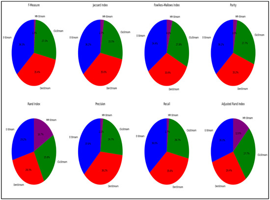 Purity is a measure utilized to evaluate the effectiveness of the E-STREAM algorithm. It is calculated by dividing the count of elements within each cluster by the total number of ground truth instances [46,47]. Purity scores vary from 0 to 1, with 0 indicating low purity and 1 indicating high purity.
