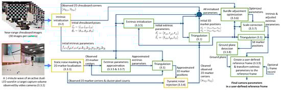 - Each camera (with index i) has 6 extrinsic parameters representing its pose with the translation and orientation of the global reference frame relative to the camera reference frame (orientation in axis-angle representation: ; translation: ) and 9 intrinsic parameters (focal length: , ; optical center: , ; distortion coefficients: , , , , and ). To simplify subsequent explanations, all 9 intrinsic parameters for camera i are written as .