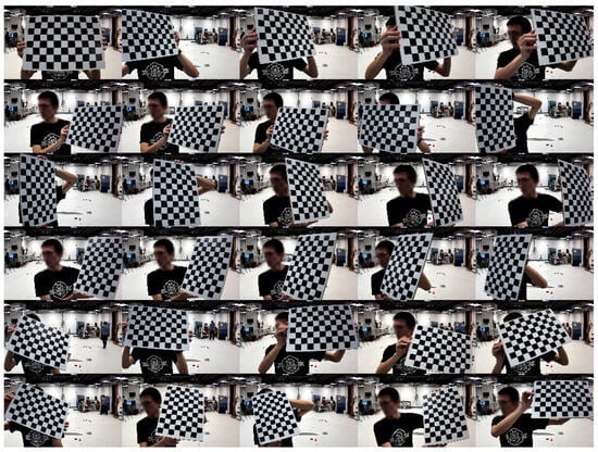 A rigid black-and-white chessboard with 10 by 7 internal corners (11 by 8 squares) and a square size of 35 mm is held still at 30 different poses in front of each camera similar to the images shown in Figure 2. The range of distances from a camera to the chessboard can vary depending on the angle of the field of view. As a reference, the distances from all cameras in our experiment are between 31 and 84 cm. The captured images are subsequently processed using standard computer vision techniques. OpenCV’s findChessboardCorners and calibrateCamera functions are used for corner detection and camera calibration, respectively. This workflow relies on Zhang’s method [3] to obtain the initial intrinsic calibration parameters. These parameters include 4 elements from the intrinsic matrix (i.e., , , , ) and 5 parameters from the distortion coefficients (i.e., , , , , and ).