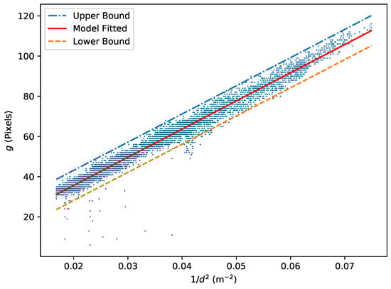 An example plot of the number of bright pixels in a cluster (g) against the inverse of the squared distance from the triangulated position to the camera (). Without the noises under the lower boundary, the distribution is fairly symmetrical on both sides of the fitted linear regression model.