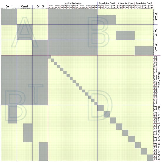If a calibration session involves N cameras, M frames, B total chessboard images, and W corners on a chessboard, the length of the input vector () is , while the residue vector () has a length of . The size of the Jacobian matrix (J) of function F used in the LM algorithm is by . An example of the Jacobian matrix structure with a set of small hyperparameters (, , , and ) is illustrated in Figure 6.