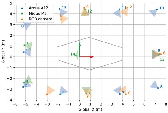 The markers of the wand are intended to be swept through the entire target capture volume. To detect the floor plane within the capture space, a specific floor-touching component is also included in the waving procedure. While waving, the user is instructed to gently touch the red marker on six matte-black plates strategically positioned on the floor near various edges of the capture volume. These matte-black plates are designed to minimize reflections from the floor, mitigating potential inaccuracies in marker-center extraction. This floor-touching step facilitates floor detection without the need for additional calibration items. An example of the waving pattern is illustrated in Figure 4. The recommended waving duration can range from as short as one minute to longer durations, depending on the size of the capture volume.