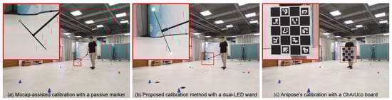 Calibration with spherical markers can vary from a single marker to multiple markers. For instance, an LED light or a laser pointer with a small piece of colored plastic attached can be used to create a bright spot for visibility from different viewpoints [14,15]. However, methods that use only one marker are unable to determine the true scale of the waving volume, leading to uncertainty about the actual distance between cameras and the capture volume. This is because the cameras can be moved closer or farther away from the waving volume without changing observation or reprojection error if the waving volume is scaled accordingly.