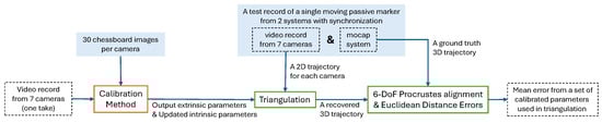 The proposed benchmarking workflow using the error between the recovered 3D trajectory in comparison with an independent ground-truth record. This benchmarking workflow is repeated 33 times with 33 different takes of video record input (i.e., 33 takes of wand waving or 33 takes of ChArUco board waving) to test the consistency of the method. Note that the data in the blue box are kept constant to ensure fairness across different calibration methods. In particular, for mocap-assisted calibration, the method also has access to the 3D trajectory of the passive marker for the corresponding take, which is not included in this figure.