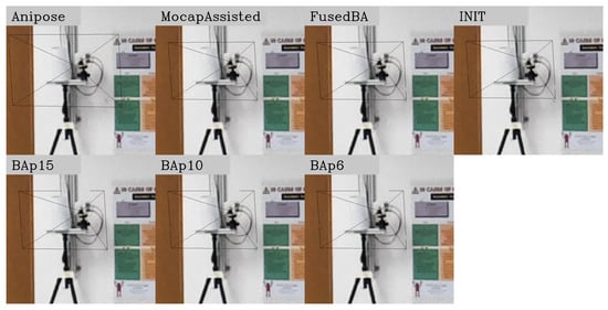 In the alignment calculation step described in Section 4.6, in addition to determining translation and rotation terms, a scaling factor is also computed, as presented in Table 2. This scaling factor serves as the multiplier for the entire capture volume to optimally minimize differences between the triangulated 3D trajectory and the ground-truth 3D trajectory from the marker-based benchmark record. A scaling factor of 1.0 means that the size of the triangulated 3D trajectory perfectly matches the ground-truth trajectory. According to the scaling factors, with an RDB triangulated trajectory, the average scales of calibrated space from the Anipose, mocap-assisted, INIT, BAp6, BAp10, BAp15, BAp15+W, FusedBA, and FusedBA+W methods are different from the ground truth by 0.4807%, 0.0011%, 0.0429%, 0.0007%, 0.0007%, 0.0196%, 0.0214%, 0.0033%, and 0.0056%, respectively.