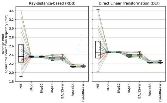 All the variants of bundle adjustment methods show significant improvements in both accuracy and consistency relative to the initialization state (INIT). A more detailed distribution of the mean errors from all 33 rounds of calibration is plotted in Figure 14. The performances of BAp6 and BAp10 are virtually the same, with large improvements in consistency. For RDB triangulation, their mean errors and standard deviations drop from the initialization state (INIT) by 4.2% and 97.1%, respectively. The fact that BAp10 does not achieve any improvement relative to BAp6 could imply that partial intrinsic adjustment of the focal length and optical center without allowing for the simultaneous adjustment in lens distortion parameters does not cause any improvement in the intrinsic parameters because they are all entangled and need to be improved together. This phenomenon is more obvious with the observable improvements in both the BAp15 and FusedBA methods that allow all the intrinsic parameters to be optimized. The BAp15 and FusedBA methods can reduce the error even further, with drops of 5.4% and 12.9% relative to INIT, respectively.