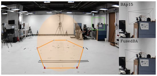 One interesting observation among the bundle adjustment variants is in the rightmost column of Table 1. This column shows the means and standard deviations of RMS projection errors of the wand markers used in the calibration record after the optimization terminates. This metric is commonly used to report the accuracy of calibration in the literature [1,6,15,25,26,27]. Although all the variants improved largely from the INIT state, being the lowest in this metric does not translate to the best 3D accuracy on the benchmark record. Specifically, for BAp15, when the lens distortion coefficients are allowed to update when the wand coverage cannot practically cover the entire camera field of view, optimization can overfit easily in the wand-waving area in the image and ignore any negative side effect of incorrect distortion in other parts of the image. An example of this phenomenon is shown in Figure 15. Even though this overfitting effect is not seen in the BAp6 or BAp10 variants, downgrading from BAp15 to BAp6 or BAp10 is a loss of opportunity for the use of additional observations from the wand-waving step to refine all the intrinsic parameters. This rationale underpins our proposal of the FusedBA method, which enables fine tuning of all intrinsic parameters while preventing the overfitting issue.
