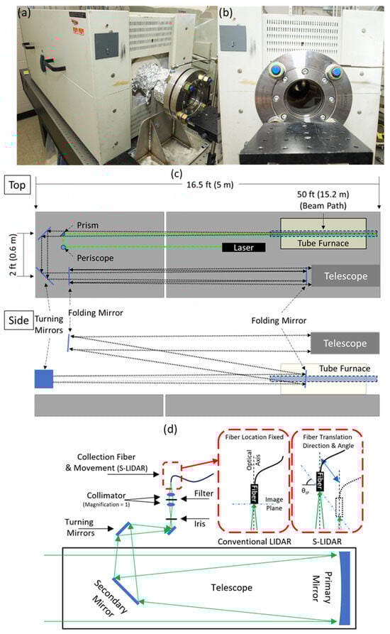 (a) Tube Furnace. (b) Front window of the Tube Furnace. (c) Top view and side view of folded beam path. The full path length is approximately 50 ft/15.2 m from the center of the furnace tube to the front of the telescope. Note: dashed green line is the excitation laser and black dotted lines represent the optical return path to the telescope. (d) Telescope collection optics and fiber translation stage. Detail shows the direction of motion of the fiber and the inclination of the image plane (θIP) used for S-LIDAR in this work and also shows the fixed mounting of the fiber used in conventional, pulsed LIDAR. Note: green lines represent the returning Raman scatter from the tube furnace.