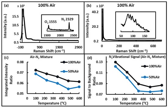 A reduction in the intensity of both the rotational and vibrational signals was observed with the increasing temperature, likely due to changes in gas density with the temperature, suggesting one possible method for determining gas temperature. For example, the signal-to-background ratio of the N2 vibrational signal was also found to decrease linearly with an increase in temperature across most of the measured range, as shown in Figure 2d. Additionally, the ratio of the low and high-frequency intensities of the rotational Raman bands was found to decrease almost exponentially with increasing temperatures, as shown in Figure 2c. It must be noted that laser-induced luminescence from the silica windows increased the background, adding noise and degrading the signal. This is particularly disruptive at higher temperatures due to the inherently lower signal.