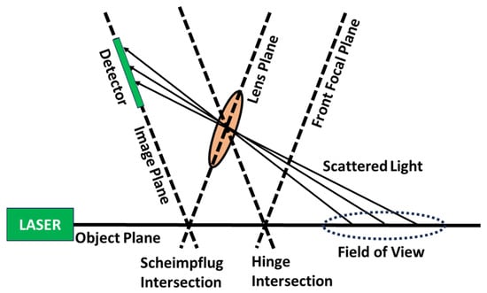 While conventional LIDAR is based on the time-of-flight measurement principle, which determines distance using the time required for scattered light to return to the instrument after the laser pulse is emitted, the S-LIDAR technique determines distance by mapping the position along the laser beam path onto the position along the image sensor via a special arrangement of the light source, optics, and detector which is known as the Scheimpflug principle. When the image plane is tilted, the plane containing the laser beam (i.e., the object plane) can be brought into focus if the lens plane and image plane intersect the object plane at the same point [,]. To obtain the focus, the intersection of the front focal plane of the lens, the object plane, and the image plane displaced to the effective center of the lens must coincide, which is known as the Hinge rule. A schematic diagram representing the Scheimpflug condition is shown in Figure 3.