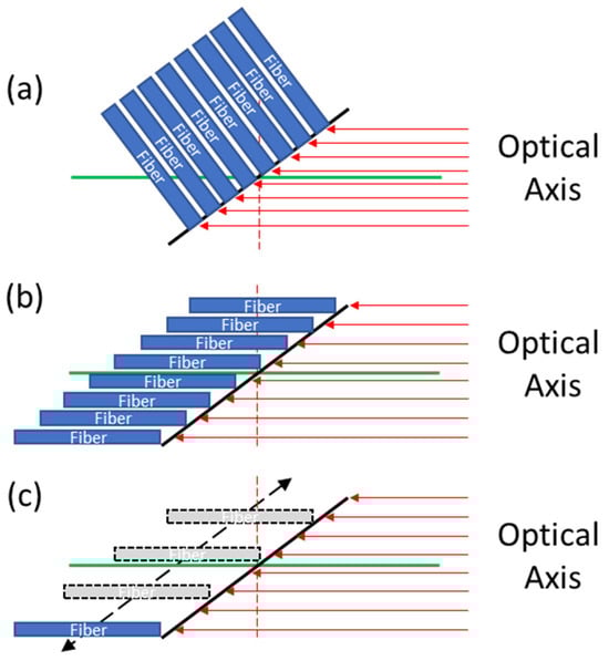 Coupling signal into a fiber/fiber bundle (a) using a typical linear bundle, (b) using a custom “stepped” bundle, and (c) translating a single fiber along the image plane (see Figure 1d). Note: green lines represent the optical axis, red arrows are the incoming signal, solid black lines are the Scheimpflug (tilted) focal plane, dashed black arrow (c) is the fiber translation direction, and vertical dashed lines are the non-Scheimpflug (not tilted) focal planes.