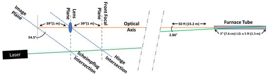 For measurements, a CW green laser (Opto Engine, MGL-N-53A-5W) operating at a wavelength of 532 nm was used. The beam entered the 3-inch (75 mm) I.D. × 5 ft (1.5 m) tube at an angle of approximately 2.86° relative to the tube axis, intersecting the optical axis at roughly the center of the tube (defined as the center of the object plane). With the object plane located 50 ft (1.52 m) and inclined at an angle of 2.86° relative to the optic axis, for a 39-inch (1 m) focal length telescope, the angle of the image/detector plane was determined to be 54.5° from vertical using Equation (S2) (see Supporting Information). This is demonstrated graphically in Figure 5, using a simplified, to-scale (approximate) representation of the optical system, showing the Scheimpflug condition is satisfied for the angles and distances involved.