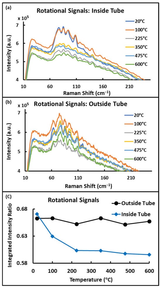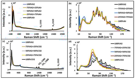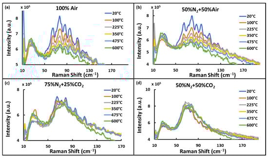 Raman spectra of the varying concentrations of Air, N2, and CO2 in the tube furnace at room temperature (20 °C) are shown in Figure 6. Both the rotational and vibrational Raman signals of the gases were observed with lower resolution grating, as shown in Figure 6a,c. However, the rotational bands were not resolved with this grating. Therefore, the higher resolution grating was used to obtain rotational bands (Figure 6b,d), although they were not completely resolved. It should be noted that these bands sit atop a pedestal extending from less than 50 cm−1 to over 500 cm−1, consisting of overlapping bands from the fused silica window of the furnace tube []. With the grating of 600 L/mm, the oxygen band was observed with its maxima at 1555 cm−1, N2 band at 2329 cm−1, and CO2 bands at 1286 cm−1 and 1388 cm−1 in the spectra. As expected, vibrational band strength was observed to increase with increasing concentration. Partially resolved rotational bands were observed in the range 60–180 cm−1 when the gas mixture contained Air or N2. However, for CO2, the rotational bands were unresolved even at the highest resolution setting (see Figure 6d). This is due to the much smaller rotational band spacing for CO2 (3.1 cm−1) as compared to N2 (8.0 cm−1) and O2 (11.4 cm−1) [].