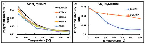 To understand the behavior of rotational signals with increasing temperatures, the ratio of low to high-frequency integrated band intensities (background subtracted) was plotted against temperature. For Air-N2 mixtures, like in pulsed LIDAR, the integrated intensity ratio decreased almost exponentially with increasing temperature, as shown in Figure 8a. For CO2-N2 mixtures, as mentioned above, high CO2 content caused poor resolution. Therefore, rotational bands of low CO2 content mixtures were considered. The integrated intensity ratio decreased with increasing temperature, as shown in Figure 8b.