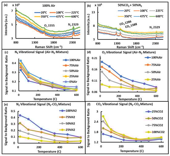 Similar to the results observed with pulsed LIDAR measurements, the intensity of vibrational signals was also observed to decrease with increasing temperature, as shown in Figure 9. The decreasing intensity of O2 and N2 signals from 100% Air is displayed in Figure 9a, and that of CO2 and N2 from the mixture having equal content of CO2 and N2 is shown in Figure 9b. Signal-to-background ratios of these vibrational bands of N2, O2, and CO2 were plotted against the temperature to study the effect of increasing temperature, using the 2329 cm−1 and 1555 cm−1 vibrational Raman bands of N2 and O2, respectively, and the summed intensity of the 1286 cm−1 and 1388 cm−1 CO2 bands. The decreasing trends of the intensity of bands of N2, O2, and CO2 were almost exponential with the increasing temperature, as demonstrated in Figure 9c–f. These decreasing trends were similar to those found with pulsed LIDAR measurements, which shows that the S-LIDAR method can be used instead of pulsed LIDAR for gas species measurements in atmospheric as well as high-temperature environments.
