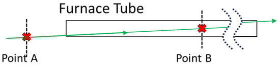 Locations along the furnace tube where S-LIDAR measurements were made. Point A lies just outside the tube’s front face, while Point B lies at the tube center. Note: the green line is the excitation laser.