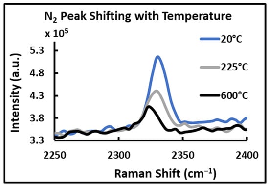 Changes in conditions like pressure and temperature can stimulate the attractive and repulsive forces between the molecules, which can result in the Raman peak position shifting [,,,]. When temperature increases, the bond length increases, and hence, the energy of the vibrational mode may decrease. Similarly, a decrease in temperature causes bond length shortening, and hence, vibrational mode energy increases. Though the pressure was not taken into account in this study, the N2 peak position was evaluated to determine if its shifting with the change in temperature can be noticed. When spectra taken from N2 gas at different temperatures were stacked together, some shifting of the N2 vibrational signal was observed, as shown in Figure 12; however, as the vibrational signals were recorded at low-resolution settings only, exact shifting could not be presented quantitatively. This may be a possibility for future investigation.