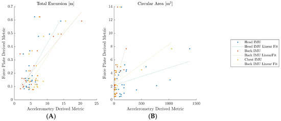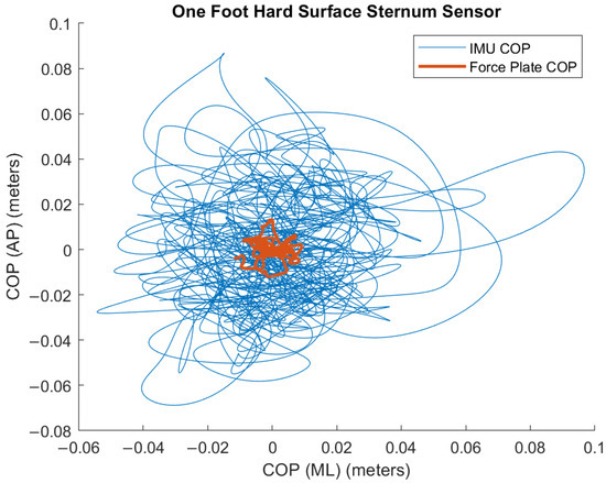 Since the force plate and the IMUs’ accelerometers have “different sensing principles, bandwidths, and geometric references”, the body sway, as traced by the IMUs, and the COP calculated from the force plate are incongruent [15]; Figure 4 confirms this notion. For this reason, correlations were examined to identify relative, as opposed to absolute, agreement between the metrics derived from the different sensors.