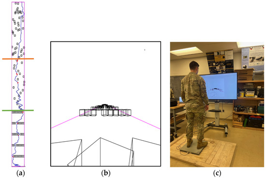 The purpose of the second part of the study was to propose a method to evaluate postural agility using a real-time interactive assessment. This assessment consisted of a custom force plate-controlled video game written in MATLAB (Mathworks; Natick, MA, USA). When introduced to the game, the subject was outfitted with IMUs as described in Section 2.1 and instructed to stand on the force plate (Figure 5c). The subjects then actively shifted their center of mass side-to-side to avoid obstacles that appeared to be moving toward them on a large screen. Figure 5b provides a screen capture of the first-person-view game, where obstacles are rotating black wireframe boxes in a white world with magenta lines bounding the edges of a path. The blocks move down the path at a constant rate while the virtual medial–lateral movement of the player is controlled by the force plate COP (accelerometry data were also collected but not currently used). When the player goes beyond the bounds of the arena or collides with a block, the boxes turn red to indicate a penalty to the subject.