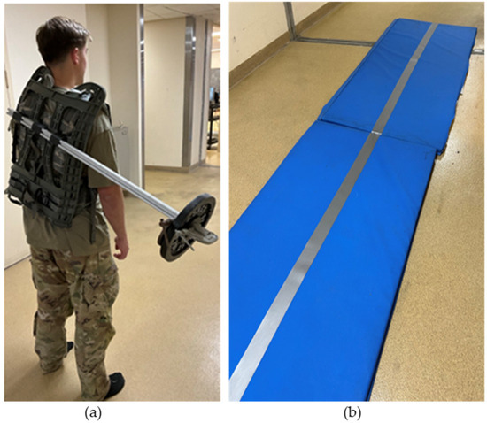 The purpose of the third part of the study was to propose a method to detect differences between stable and increasingly unstable dynamic walking tasks using a single body-worn accelerometer. IMUs were placed on each participant’s forehead, sternum, lower back, and right ankle, as discussed in Section 2.1 (Figure 2). Participants were asked to walk in their socks along a 15 m straight path in each of four randomized conditions. For two of the conditions, participants walked on a hard surface both unloaded and asymmetrically loaded using a 10 lb weight affixed to a backpack frame at a distance of 0.7 m from the body midline, with hip and chest straps secured (Figure 6a). The same two unloaded/asymmetrically loaded conditions were also executed along a 13 m soft mat that was 3.5 cm-thick with a tape line down the center, along which the participant placed their feet as they walked (Figure 6b). The distance was intentionally shorter to account for the slower pace and decreased step lengths on this surface. During each of the walking trials, accelerometer data were collected at 1125 Hz, and only data relative to the participant’s medial–lateral axis were used for further analysis.