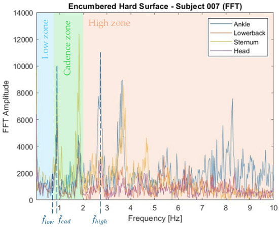 Raw accelerometry data were converted to the frequency domain using fast Fourier transform (FFT) after the DC offsets were first subtracted. To extract meaningful features from this frequency domain dataset, three frequency zones were established. The “low” walking frequency zone ranged from 0 to 0.8 Hz, the “cadence” zone ranged from 0.8 to 2 Hz, and the “high” zone ranged from 2 to 10 Hz. These zones were used based on the well-documented fact that the unencumbered human gait tends to occur near 1 Hz [44], while signals much higher than 10 Hz are unlikely to have a musculoskeletal origin. Within each zone, the frequencies corresponding to the highest amplitude peaks (, , and , respectively) were found. Figure 7 shows these peak frequencies for the ankle accelerations as an example case, though the peak frequencies in the three zones were extracted from each sensor location. The low-to-cadence and cadence-to-high frequency ratios and were then calculated as follows: