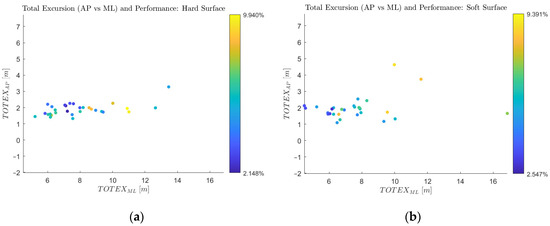 Data from 10 of the 11 total participants were included in the results presented below. Figure 9 shows the total excursions of the 30 hard-surface and 30 soft-surface trials (three per subject). The color of each datum corresponds to the penalty incurred by the subject while playing the game (the lower the penalty, the higher the performance on the game). As expected, there was substantially greater excursion in the medial–lateral direction than the anterior–posterior direction on average. The range of every subject’s conscious side-to-side motion exceeded their subconscious forward–backward motion as they played the game. Furthermore, while much more data are necessary to fully populate the feature space, there is an apparent trend that a of 6–7 m corresponds with optimal game performance. For the hard-surface condition, this apparent optimum was slightly larger than for the soft-surface. The worst-performing participants tended to have large scores, and appeared to have a larger correlation with poor performance when the surface was soft. Table 3 summarizes the averages of all metrics for hard and soft conditions.
