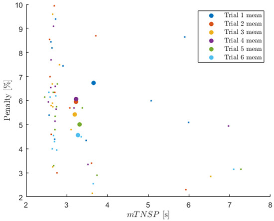 Figure 10 presents the penalty score and for all subjects and trials, with large dots indicating the mean over all subjects for each trial number. As the figure shows, the penalty scores consistently decreased (with the exception of trial 4), which demonstrates an overall improvement in performance. There was also a general reduction in from trial 1 to trial 6, though this trend was much weaker. The penalty and did not appear to show any strong correlation.