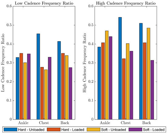 The initial results of the dynamic stability trials are shown in Figure 11. These findings suggest that and may be useful for detecting dynamic instability. Due to a systematic issue with the sensor on the lower back, insufficient data were available for that sensor location. The ANOVA suggested that there was a significant interaction between sensor location and surface for (p < 0.01), and a trend toward an interaction for (p = 0.12). This suggests that the sensors may have varying capacity to detect differences between walking surfaces and that the chest and head sensor locations may be particularly useful for detecting differences between relatively stable (hard surface, unloaded) and unstable (soft surface, asymmetrically loaded) conditions. For both frequency ratios, the hard surface, unloaded condition showed higher ratios than the soft surface, asymmetrically loaded condition, suggesting that the peak amplitudes were closer to the frequency of gait. The other two walking conditions tended to show ratio values that were between the most stable and unstable conditions, but there was not a clear trend.