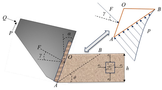 In this equation, p0 is the unknown coefficient, a constant; h represents the depth of the tool’s penetration into the rock mass; is the angle between the straight line AB and the cutting direction; x is the distance from point A to a specific point along the straight line AB; and is the stress distribution coefficient, which is related to the shape of the cutting edge and remains constant during the cutting process.