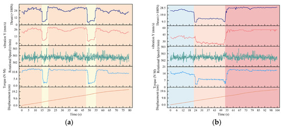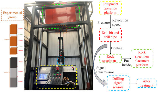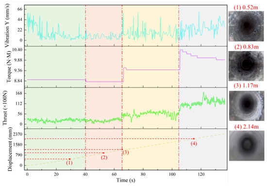 During drilling, data on torque, thrust, rotational speed, and Y-direction vibration of the drill rod were collected and recorded using drilling signal sensors. These sensors operated at a frequency of 60 Hz, sampling every 0.02 s. To mitigate signal interference, the collected data were preprocessed by trimming signals recorded before the drill bit reached the bottom interface of the specimens and during retraction. Due to the large volume of data, unclear frequency structure, and significant interference, wavelet denoising was employed to reduce noise and refine the signals. The processed signal accumulation diagram is shown in Figure 3. The different colored boxes in the actual picture of the equipment represent the different components of the different drilling systems and are consistent with the different colored boxes on both sides.
