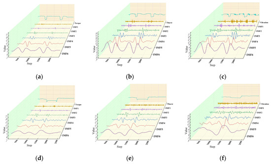 Drilling signal complementary ensemble empirical mode decomposition diagram. (a) Separation layer (torque); (b) separation layer (thrust); (c) separation layer (vibration); (d) rock strata (torque); (e) rock strata (thrust); (f) rock strata (vibration).
