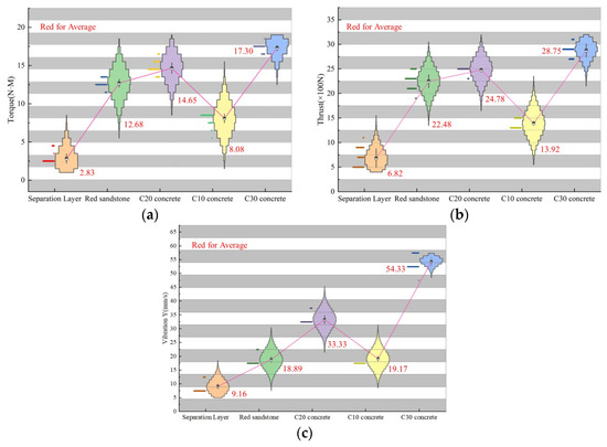 To better analyze the differences between various drilling targets, we extracted thrust, torque, and Y-direction vibration signals from two datasets and created violin plots, as shown in Figure 5a. The torque values, arranged from smallest to largest, are as follows: interlayer space, C10 concrete specimen, red sandstone specimen, C20 concrete specimen, and C30 concrete specimen. The data distribution densities are relatively concentrated: torque in interlayer spaces ranges from 2.1 to 3.3 N·m, in red sandstone from 11.7 to 13.5 N·m, in C10 concrete from 5.8 to 8.4 N·m, in C20 concrete from 13.4 to 16.1 N·m, and in C30 concrete from 16.5 to 17.9 N·m. The significant variation in torque among different drilling targets makes it a key indicator for identifying deterioration zones. Similarly, as illustrated in Figure 5b, thrust values are arranged in the same order: interlayer space, C10 concrete specimen, red sandstone specimen, C20 concrete specimen, and C30 concrete specimen. Thrust in interlayer spaces ranges from 439 to 910 N, in red sandstone from 1940 to 2270 N, in C10 concrete from 1260 to 1340 N, in C20 concrete from 2390 to 2520 N, and in C30 concrete from 2670 to 2925 N. The considerable variation in thrust among drilling targets further confirms its importance as an indicator for deterioration zones. Figure 5c shows the Y-direction vibration values, also arranged from smallest to largest: interlayer space, C10 concrete specimen, red sandstone specimen, C20 concrete specimen, and C30 concrete specimen. Y-direction vibration in interlayer spaces ranges from 8.9 to 11.1 mm/s, in red sandstone from 15.9 to 20.2 mm/s, in C10 concrete from 17.8 to 20.6 mm/s, in C20 concrete from 31.2 to 35.8 mm/s, and in C30 concrete from 48.9 to 55.4 mm/s. The substantial differences in Y-direction vibration across drilling targets highlight its role as a critical indicator for identifying deterioration zones.