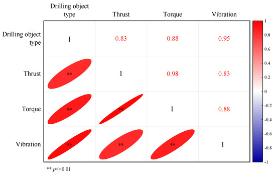 To analyze the sensitivity indicators between the types of drilling objects and the three drilling parameters, the drilling objects were categorized numerically, establishing a correspondence between the drilling objects and the drilling parameters. A correlation analysis was conducted on the generated data, with the results presented in Figure 6. The correlation coefficient between thrust and the type of drilling object was found to be the highest at 0.88, indicating that thrust is a strong indicator of changes in the drilling object. This was followed by torque and vibration. Among the drilling parameters, the correlation between torque and thrust was the strongest, suggesting that thrust and rotational cutting force exhibit a coordinated and synchronous variation. In summary, there is a positive correlation between the type of drilling object and the drilling parameters, as well as a positive correlation among the three drilling parameters themselves.
