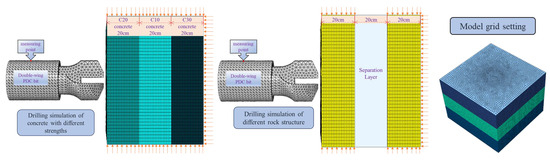 To better validate the response pattern of drilling signals to the layered space, a model of a mining two-wing PDC drill bit was established using SolidWorks software, and two design schemes were created, as shown in Figure 7. These schemes consider combinations of rock layers and layers of varying strengths. The right side of Figure 7 illustrates different structural combinations of rock layers, with a 20 cm thick gap left between the two rock mass models. The dimensions of the red sandstone specimens are 50 cm × 20 cm × 50 cm. The middle view of Figure 7 displays the combination of rock layers with different strengths, specifically C20 concrete, C10 concrete, and C30 concrete, with the same specimen dimensions of 50 cm × 20 cm × 50 cm, while the drill bit moves in the positive Y direction. After the model was constructed, it was imported into the ABAQUS numerical simulation software for computation. During the drilling process, the drill bit is assumed to be rigid and not subject to wear due to drilling; thus, it is simplified as a rigid body, and the surrounding rock mass is completely fixed. Since the rock-breaking process primarily occurs in the area of the rock model corresponding to the direction of the PDC drill bit, we performed mesh refinement in a specific region of the rock specimen aligned with the drilling direction to better simulate and calculate the PDC drilling and rock-breaking process. In contrast, locations further away from the PDC drill bit’s drilling direction were not subjected to mesh refinement. In this experiment, the refined mesh region predominantly utilized hexahedral elements with a mesh size of 1 mm. In the drill feed direction (Y direction), the model was further refined with a mesh edge length of 2 mm; the unrefined mesh at the far end also primarily employed hexahedral elements. The right side of Figure 7 provides a schematic representation of the model’s mesh partitioning. To effectively simulate the deformation and failure of the rock mass, a linear elastic model was employed for the elastic phase of the rock mass, while the Drucker–Prager model was utilized for the plastic phase. The parameters for the rock mass are detailed in Table 2. The distance between the drill bit and the rock specimen was maintained at 2 mm, with a reference point set at the drill bit’s end, to which a velocity of 60 cm/s and a rotational speed of 51 rad/s were applied. The analysis time step was set to 1 s. Since all data on the rigid body are equal, any node at the top of the drill bit was selected as a measurement point to extract the torque and thrust parameters at each frame, thereby validating the response pattern of the drilling signal.