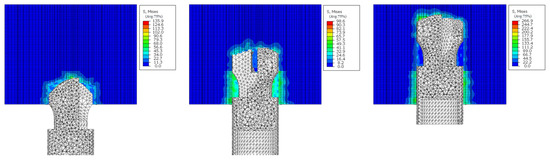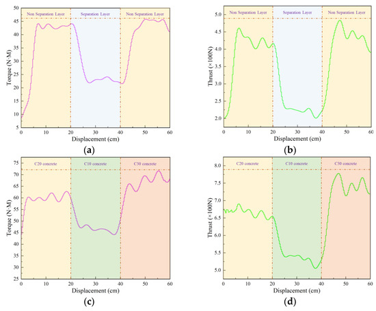 Figure 8 is the Mises stress distribution under different strength rock strata combinations obtained by simulation. From the diagram, it can be seen that the stress distribution pattern is consistent with the strength of the drilled object. With the increase in the strength of the drilled rock, the Mises stress also increases. In order to further analyze the response relationship between rock structure, rock strength, and drilling parameters, Figure 9 illustrates the drilling signals at different interfaces, with distinct colors demarcating the boundaries between various drilling targets. Figure 9a,b present the thrust and torque signals for the combination of red sandstone and interlayer space. At these interfaces, a pronounced change in the drilling signals is observed: both thrust and torque experience a sharp decline when transitioning from red sandstone to the interlayer space and a sudden increase when transitioning back from the interlayer space to red sandstone. Figure 9c,d display the thrust and torque signals for concrete specimens of varying strengths. Similar to the interlayer space scenario, abrupt changes are evident at the boundaries between different concrete strengths. The drilling signals exhibit a “medium-weak-strong” pattern, with slight amplitude variations noted in drilling targets with higher strength.
