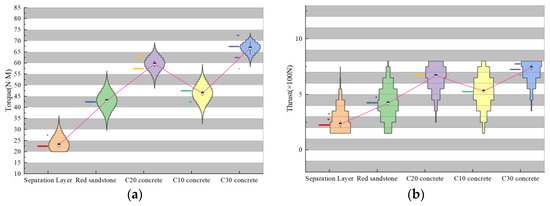 To better characterize the variation in drilling parameters across different drilling targets, we extracted thrust and torque data from two scenarios and combined them to create violin plots, as illustrated in Figure 10. To more accurately represent the effect of rock strength changes on drilling parameters, the strength of the C10 concrete specimen was set slightly higher than that of the red sandstone specimen. This setup ensures that aside from the differences in drilling parameters between C10 concrete and red sandstone, the trends observed in other scenarios are consistent with laboratory experiments. The thrust and torque values, ordered from smallest to largest, are as follows: interlayer space, red sandstone, C10 concrete, C20 concrete, and C30 concrete. This analysis confirms that drilling signals effectively identify changes in rock strength and detect deterioration zones based on rock strength.