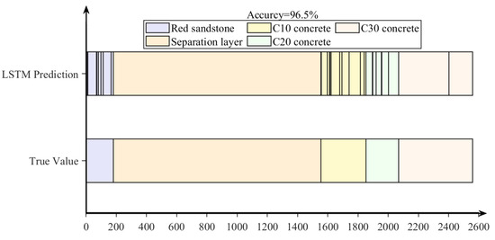 Based on the previous analyses, thrust, torque, and Y-direction vibration are highly sensitive to changes in drilling targets and rock strength. In mining operations, roof deterioration zones primarily consist of interlayer spaces and weak rock layers. Timely and accurate control of the development and damage of these deterioration zones is crucial, making real-time identification and intelligent prediction essential. Deep learning algorithms are currently prevalent in data processing, recognition, and prediction tasks. Among these, the Long Short-Term Memory (LSTM) network, which incorporates a gating mechanism, effectively mitigates the vanishing gradient problem, allowing it to process longer sequence data. Compared to traditional Recurrent Neural Networks (RNNs), LSTMs exhibit superior memory performance, enabling the retention of distant contextual information when handling sequential data [31]. Additionally, LSTMs are sensitive to time, allowing them to learn patterns and features within temporal data. This capability provides LSTMs with advantages in tasks such as time series forecasting and signal processing. However, the computational complexity of LSTMs can be substantial and time-consuming, and their intricate internal mechanisms can make the decision-making process of the network less intuitive and harder to interpret. Given that drilling signals possess temporal characteristics and a large volume of data samples is generated during the experimental process, this study proposes a recurrent neural network based on the LSTM approach to achieve intelligent identification and prediction of roof deterioration zones according to drilling parameters. In the initial experimental design, four sets of experiments were developed: two sets involving layered spaces and two sets comprising different combinations of concrete specimens with varying strengths. One group was utilized to extract signal features as the training dataset, while the other group served as the testing dataset to validate the accuracy of the LSTM-based intelligent identification method for drilling parameters related to the drilled objects. Figure 11 and Figure 12 present the comparison of prediction accuracy for the testing dataset and the confusion matrix, respectively.