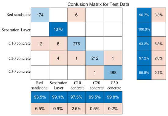 Figure 11 illustrates the classification predictions of drilling targets using the LSTM recurrent neural network, with a prediction accuracy of 96.5%. The vertical lines in the LSTM predictions represent regions predicted as different drilling targets. Due to the large number of samples, these lines are densely packed. The density of these lines indicates that the LSTM method performs effectively in identifying interlayer spaces and C30 concrete specimens, though it exhibits slightly reduced accuracy for medium-strength rock specimens. Figure 12 shows that the recognition rate for interlayer spaces is 100%, while the lowest recognition rate for other drilling targets is 93.2%. Based on the strengths of the drilling targets, this study defines red sandstone specimens, interlayer spaces, and C10 concrete specimens as deterioration zones. The method achieved a 96.6% accuracy rate in identifying these deterioration zones. Overall, the proposed LSTM-based intelligent recognition method demonstrates strong performance in identifying and predicting drilling targets using laboratory data. However, given that anchoring holes are constructed in underground tunnels with more complex geological and stress conditions, further validation is required to apply this method effectively in real field conditions for controlling roof deterioration zones.